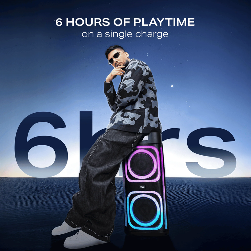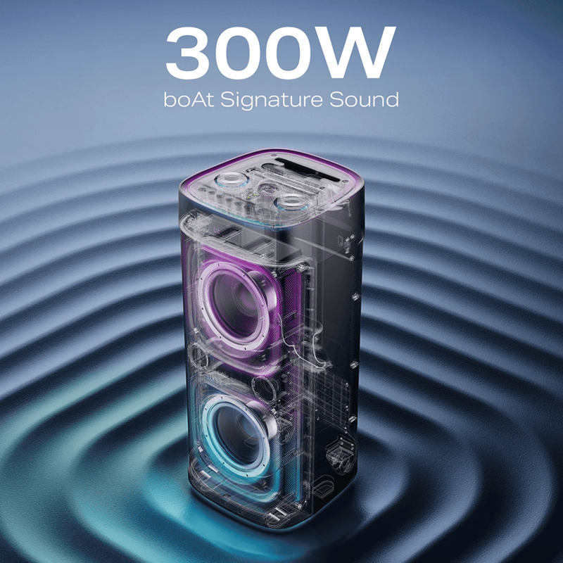 - Power output: The speaker delivers 300W of "boAt Signature Sound," providing strong bass and clear audio.