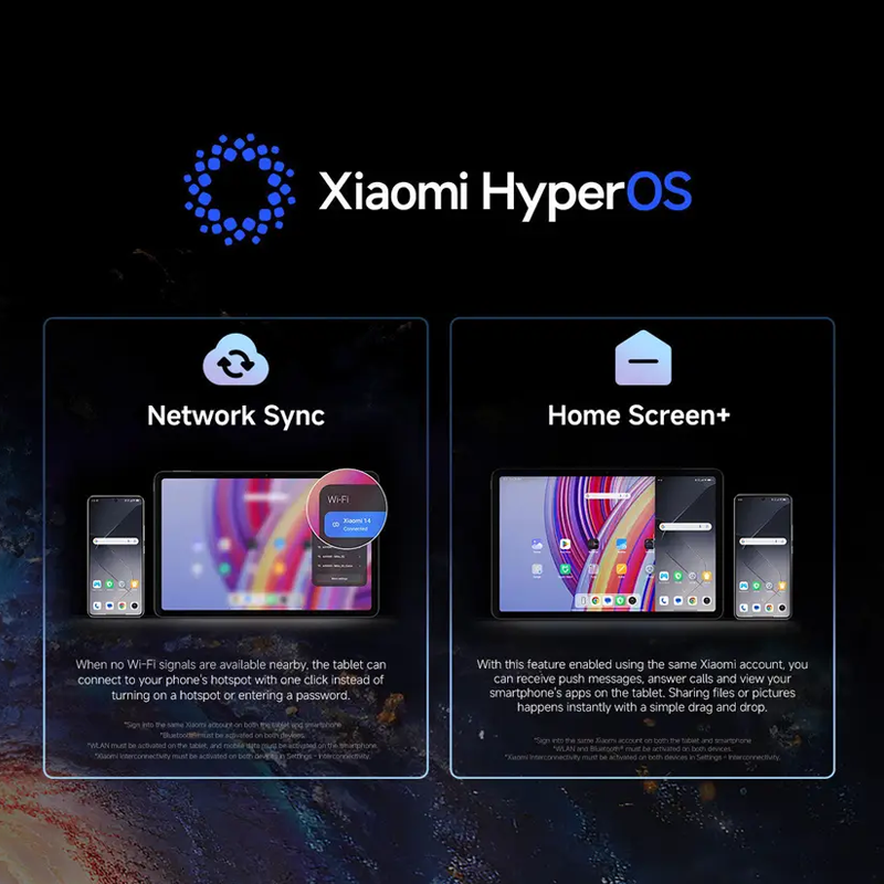 - HYPEROS INTERCONNECTIVITY: HyperOS unlocks a world of seamless interconnectivity between your Xiaomi Smartphone and Redmi Pad Pro. Network Sync simplifies hotspot connection with a single click. Home Screen+ lets you receive messages, answer calls, and access your phone's apps directly on the tablet. Sharing files and photos becomes effortless with drag-and-drop functionality. Plus, a shared clipboard lets you copy and paste content seamlessly between your devices.